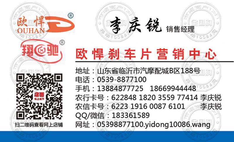 欧悍刹车片山东营销中心名片-13884877725