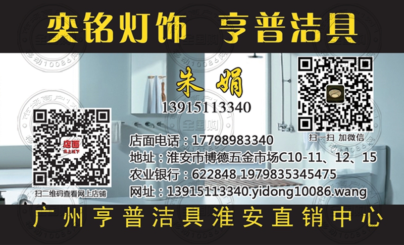 淮安奕铭灯饰 亨普卫浴名片-13915113340
