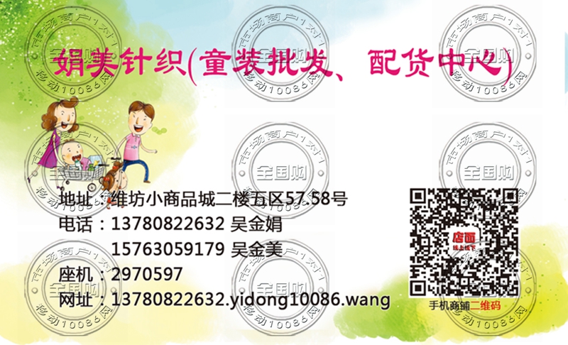 娟美针织(童装)批发、配货中心名片-13780822632