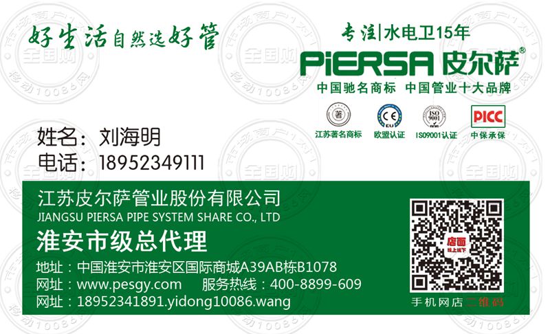 江苏皮尔萨管业股份有限公司淮安市级总代理名片-18952341891