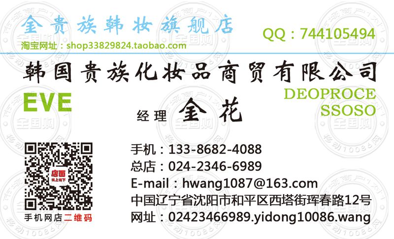韩国贵族化妆品商贸有限公司名片-13386824088