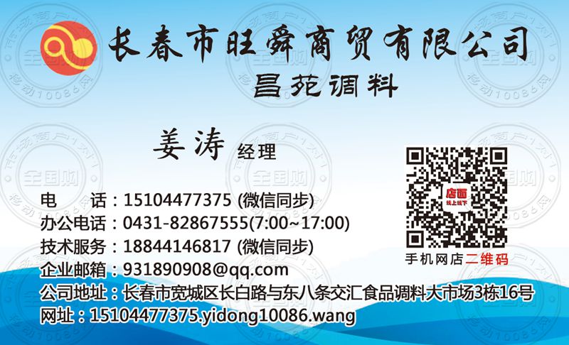 地址:长春市宽城区长白路与东八条交汇食品调料大市场3栋16号