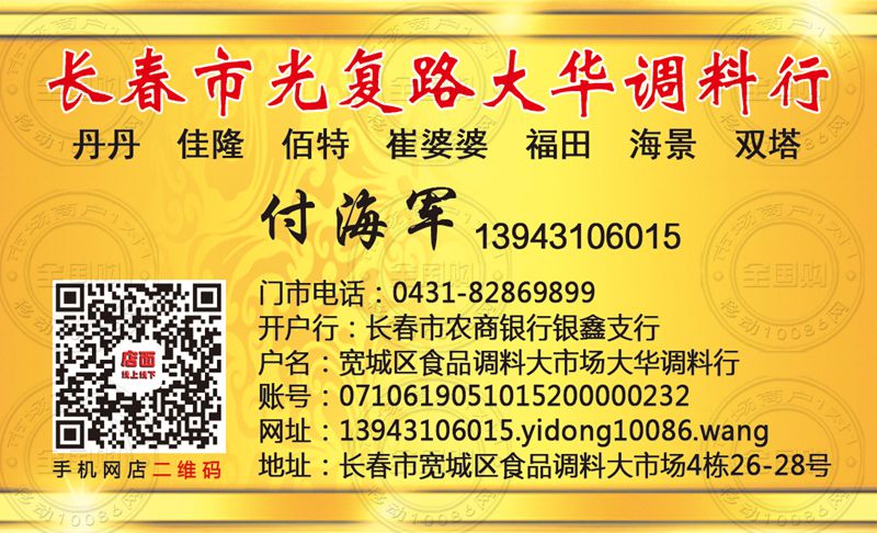 地址:长春市宽城区食品调料大市场4栋26-28号