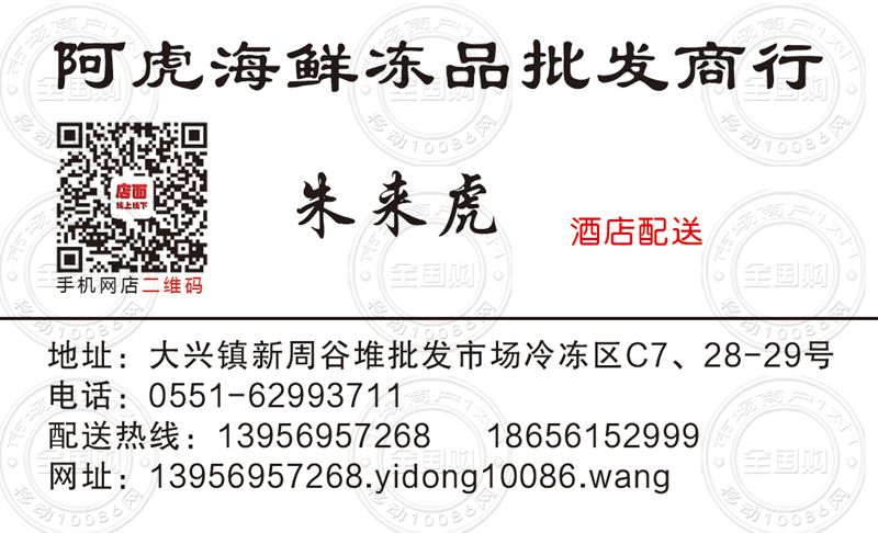 安徽阿虎海鲜冻品批发商行名片-13956957268