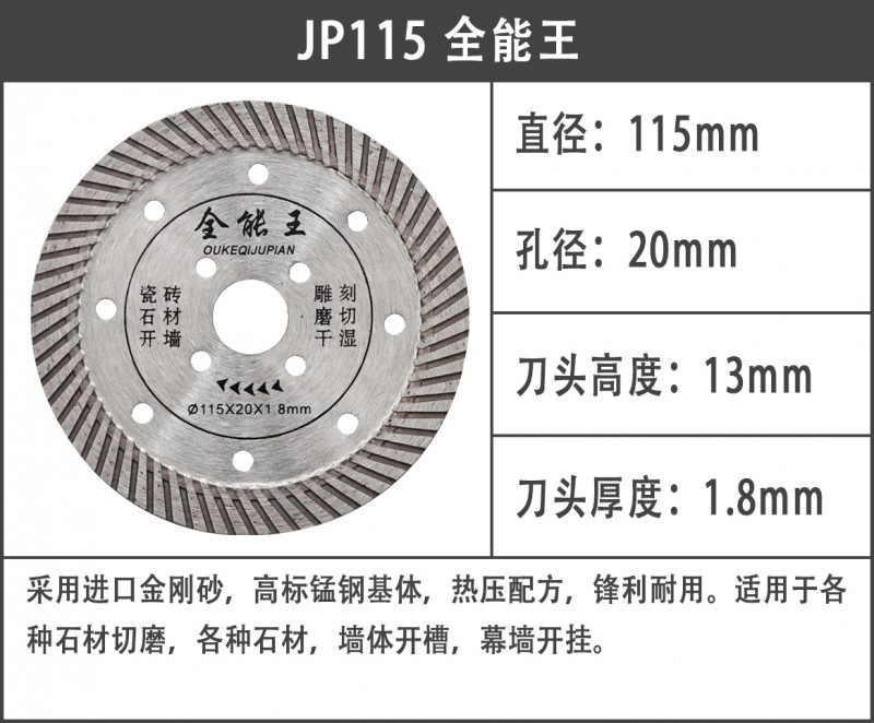 采用进口金刚砂,高标锰钢基体,热压配方,锋利耐用。适用于各