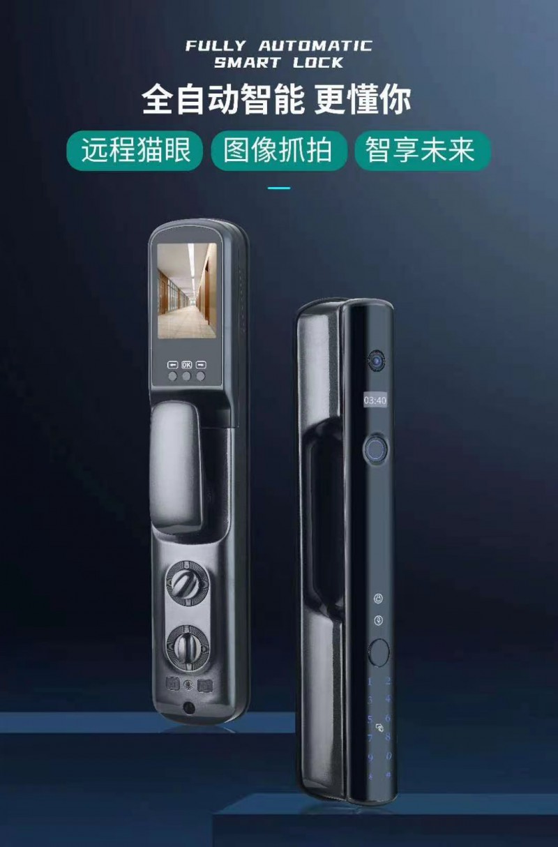 功能:指纹、密码、卡片、机械钥匙、远程开锁、猫眼功能、报警功能等